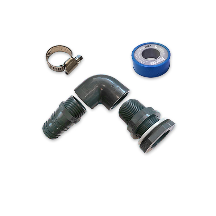 This product can be installed by you easily. First drill a hole with a diameter of 61mm in the tank on the wanted position. Twist the grey nut off the tank connection and take of the white plastic ring. From inside the tank now stick the rest of the tank connection with the rubber seal still on it through the drilled hole. (beware: you should be able to reach the drilled hole from the inside of the tank). Now slide the white plastic ring over the tank connection and then screw the grey nut on tight. Now there is a connection with external thread left sticking out of the tank. On this thread the other products can be screwed on. Beware thas all thread connections should have 6 wraps of PTFE-tape around them. When this is done you can connect the hose to the hose tail please make sure you use a hose clip to tighten them together. All suitable products you can find below.