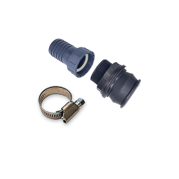 With our PP Tank Connection Set you can easily install an additional connection for inlet, outlet or overflow on the water tank/plastic tank. To prepare, drill a hole of the required size, for this connection Ø 70mm, at the desired position in the tank. Insert the Push-In BSP Fitting into the hole from the outside and tighten the nut from the outside. As a result the EPDM gasket expands inside the tank and completely seals the opening. The Push-In BSP Fitting is now completely installed from the outside and you can screw the Hosetail with internal thread onto the external thread of the Push-In BSP Fitting.