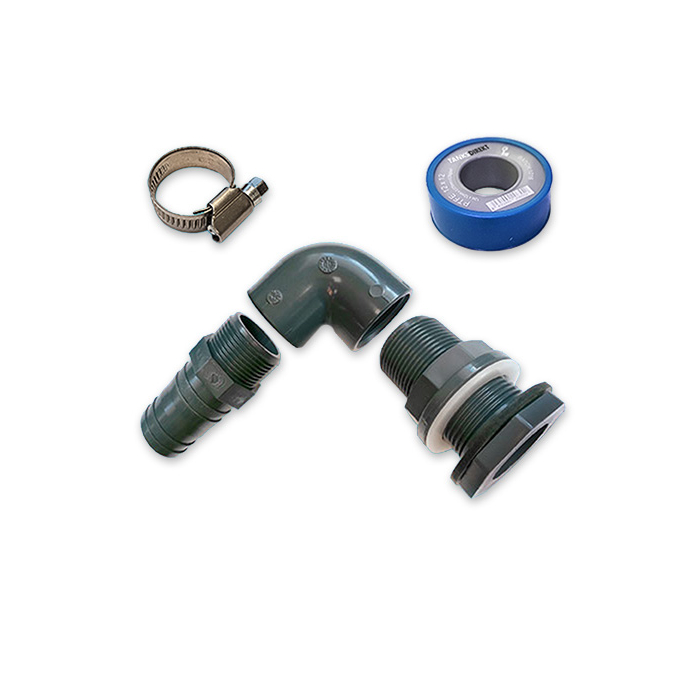 This product can be installed by you easily. First drill a hole with a diameter of 42mm in the tank on the wanted position. Twist the grey nut off the tank connection and take of the white plastic ring. From inside the tank now stick the rest of the tank connection with the rubber seal still on it through the drilled hole. (beware: you should be able to reach the drilled hole from the inside of the tank). Now slide the white plastic ring over the tank connection and then screw the grey nut on tight. Now there is a connection with external thread left sticking out of the tank. On this thread the other products can be screwed on. Beware thas all thread connections should have 6 wraps of PTFE-tape around them. When this is done you can connect the hose to the hose tail please make sure you use a hose clip to tighten them together. All suitable products you can find below.