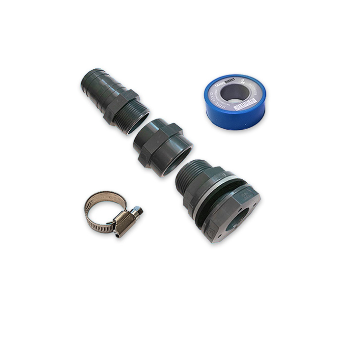 This product can be installed by you easily. First drill a hole with a diameter of 49mm in the tank on the wanted position. Twist the grey nut off the tank connection and take of the white plastic ring. From inside the tank now stick the rest of the tank connection with the rubber seal still on it through the drilled hole. (beware: you should be able to reach the drilled hole from the inside of the tank). Now slide the white plastic ring over the tank connection and then screw the grey nut on tight. Now there is a connection with external thread left sticking out of the tank. On this thread the other products can be screwed on. Beware thas all thread connections should have 6 wraps of PTFE-tape around them. When this is done you can connect the hose to the hose tail please make sure you use a hose clip to tighten them together. All suitable products you can find below.