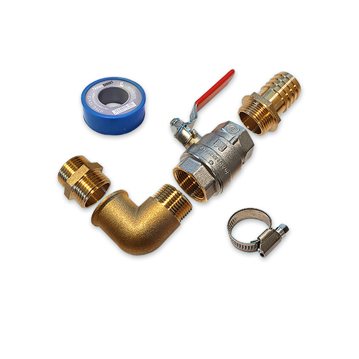 Tank Connection Set Brass 90° bend Sockett. Consisting: Knee Socket 1 Inch IN/EX, 1 Inch Ball Valve IN/IN and Hosetail 25 mm x 1 Inch EX