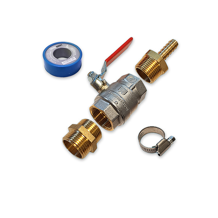 Tank Connection Set Brass straight. Consisting: 1 Inch Ball Valve IN/IN and Hosetail 13 mm x 1 Inch EX
