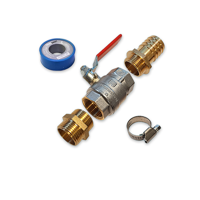 Tank Connection Set Brass straight. Consisting: 1 Inch Ball Valve IN/EX and Hosetail 25 mm x 1 Inch EX